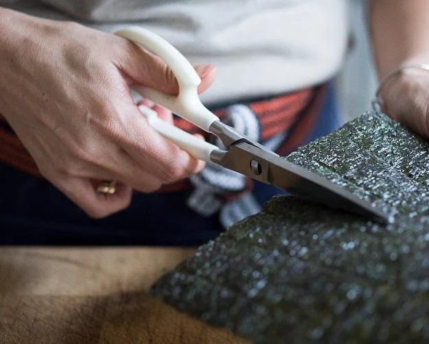 Приступаем к сворачиванию роллов. Разрежьте листы нори пополам, чтобы из каждого получилось два прямоугольника.