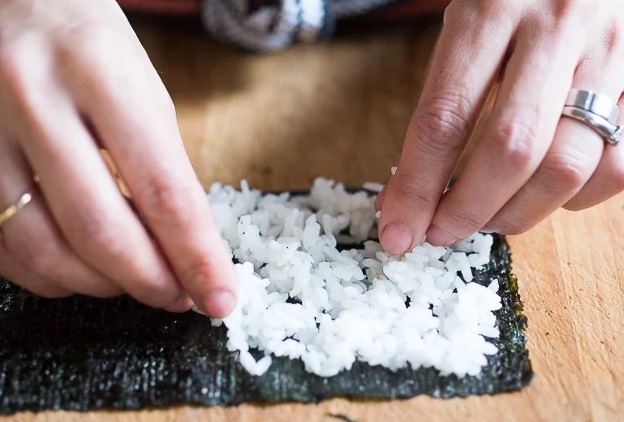 Положите лист нори перед собой шершавой стороной вверх. Выложите рис (пальцами или обратной стороной ложки) на левую половину листа, оставив с каждого края по 0,5-1 см и 6-8 см без риса на правой стороне.