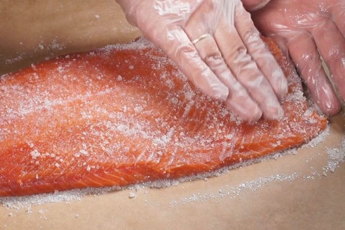 Тщательно натрите филе смесью, выстлав на пергамент. Переверните рыбу чешуёй кверху и натирайте определённо равно. Переверните мясо пару раз.