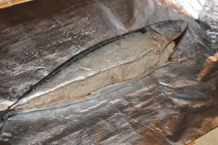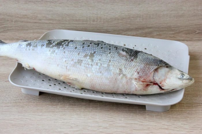 - Перед приходом гостей достаньте филе из морозилки, удалите чешую с рыбы.