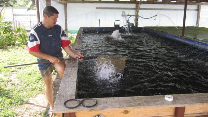 СПРАВКА! Плотность заселения прудовой площади тщательно вымеряется. На 1 га сажают 1000 годовиков, если применяются интенсивные методы кормления, то цифру можно увеличить до 50 раз. Особей старше двух лет рассаживают по садкам в расчёте 30 штук на 1м3.