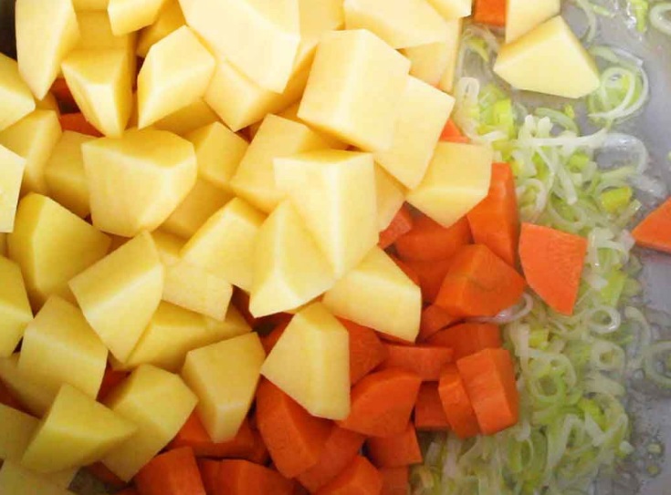 Поставьте на средний огонь кастрюлю со сливочным маслом. Лук-порей тонко нарежьте. Когда масло растает, выложите лук. Готовьте, слегка помешивая, пока лук не станет мягким. Картофель и морковь очистите и нарежьте мелкими кубиками. Добавьте овощные кубики в кастрюлю к луку, перемешайте.