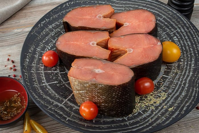 Если рыба очень крупная, рекомендуется разделить горбушу на две части, удалив позвоночник и крупные кости. Также больших рыбин допустимо разрезать на равные порционные куски. Можно использовать уже обезглавленные тушки.
