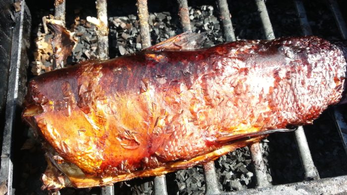 Коптить 35 – 40 минут. Главное, не передержать рыбу, иначе горбуша горячего копчения будет горькой от дыма. Точное время приготовления зависит от степени жара мангала, размера и веса рыбы. По окончании приготовления горбуша должна приобрести золотистый оттенок.