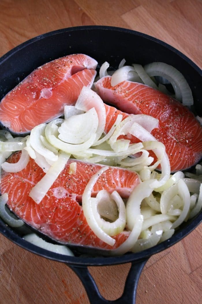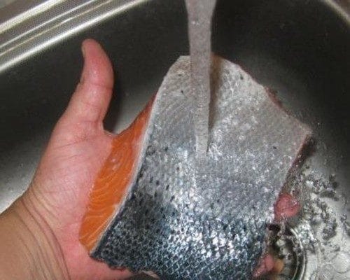 Лосось готовим, как в предыдущем рецепте – моем, чистим, режем на куски, складываем в миску. Далее следуем такому плану действий.
