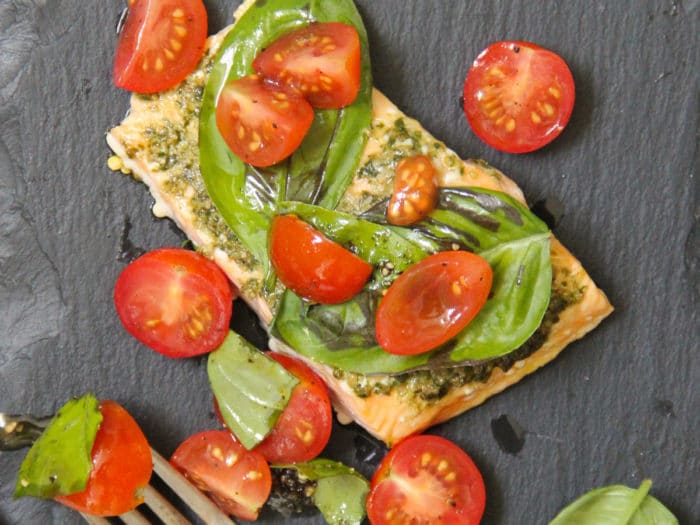 - Томаты подаются к запеченному лососю.