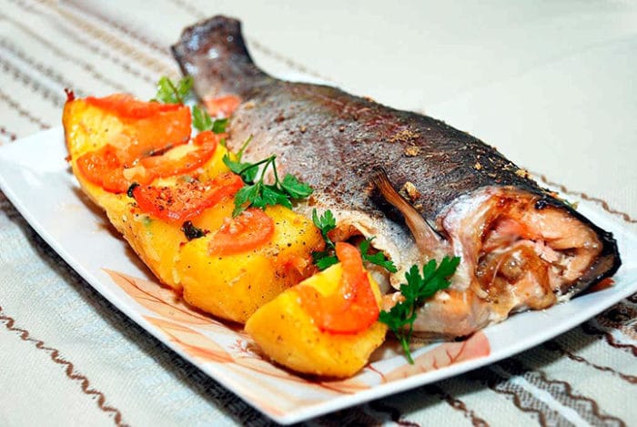 - Рыба достается из духового шкафа и подается вместе с соусом.