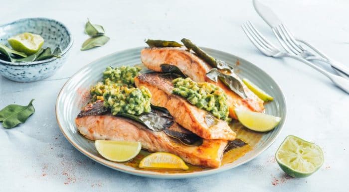 Этот лосось запеченный в духовке готовится с большим количеством специй и фруктов. Рецепт достаточно яркий и нетрадиционный. Необходимо будет потрудиться около 1 часа, чтобы подать его на стол. Пищевая ценность на 100г продукта составляет: