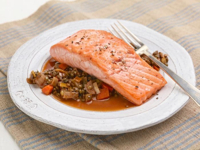 Этот вариант приготовления хорош для обеда в семейном кругу. Сочетание чечевицы и лосося дает обильный заряд белка организму. На рецепт уйдет приблизительно 1 час с учетом приготовления бобовых. КБЖУ составляет: