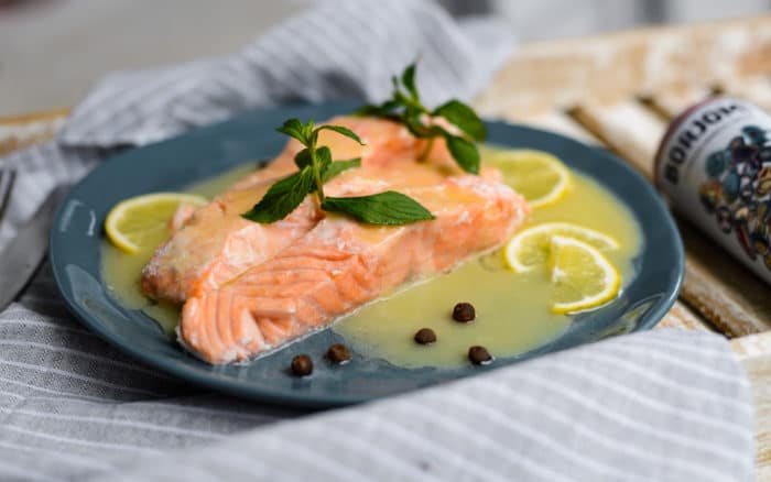 Классическое сочетание рыбы с белым вином можно объединить в одном рецепте. В качестве дополнительного ингредиента используется соус из этого алкогольного напитка. Время приготовления составляет порядка 30 минут. Пищевая ценность 100 г красной рыбки представлена следующими цифрами: