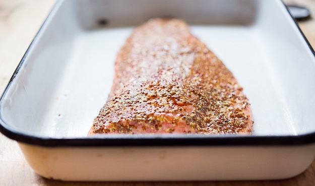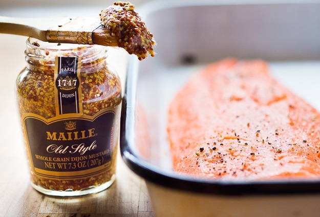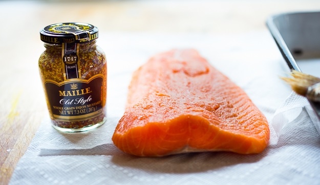 Щедро смажьте лосося горчицей с помощью кисточки или обратной стороны ложки.
