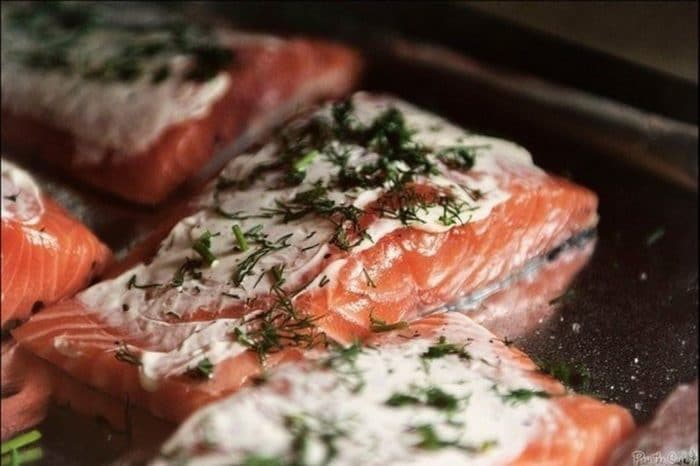 - Залить соусом форму с лососем и запекать 25 минут в духовом шкафу, прогретом до 200°С.