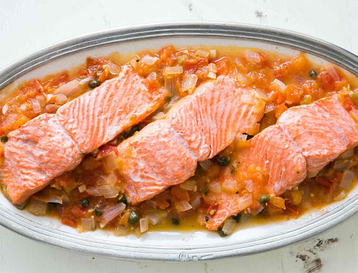 - Затем добавить к стейку лосося и запекать 20 минут.