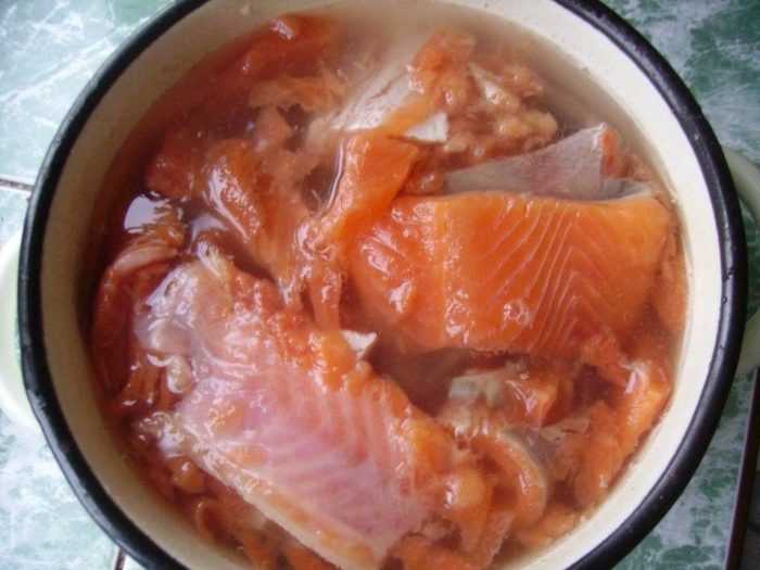 Если рыба цельная, то отрезаем голову, плавники, удаляем внутренности уделяя особое внимание черной пленке внутри брюшка. Потрошеную тушку тщательно промываем. Нарезаем на порционные куски через хребет. В подогретой воде растворяем соль и остужаем до комнатной температуры. В емкость с крутым солевым раствором погружаем горбушу на 20 минут