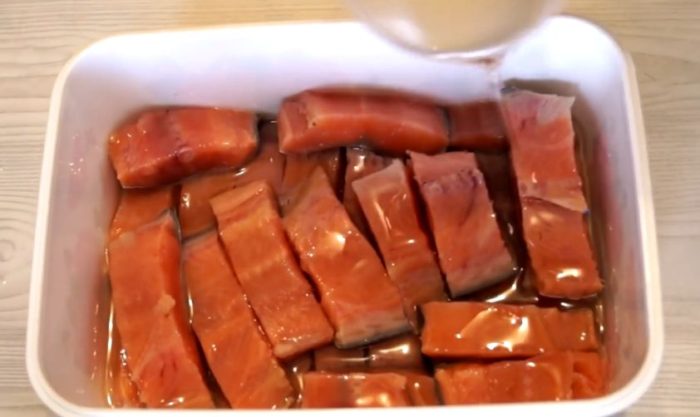 - Складываем кусочки горбуши в емкость и заливаем полученной смесью на 10 минут.