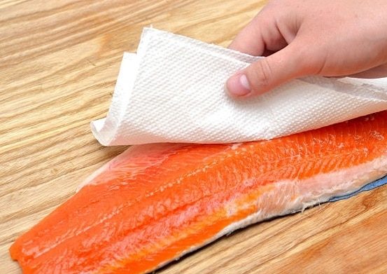 - Рыбину плотно заворачивают в чистое сухое полотенце и в полиэтиленовый пакет, чтобы выделяемый в процессе маринования сок не запачкал холодильную камеру.