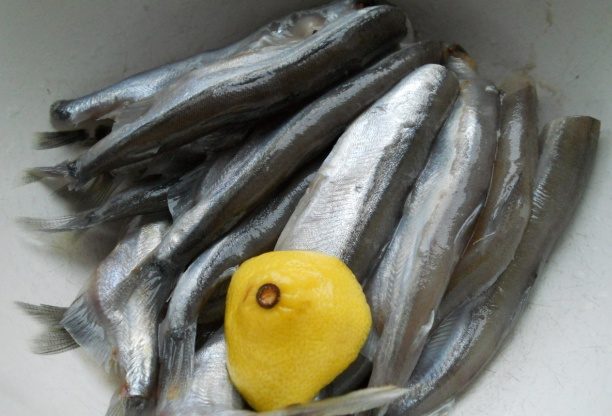 Рыба поливается лимонным соком, который отобьёт неприятный запах. Немного смочив каждую рыбку соком, их оставляют мариноваться на 10–15 минут.