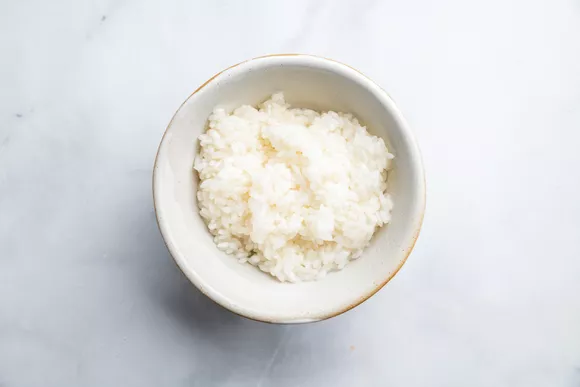 Поместите отваренный рис в небольшую миску. Если вы используете оставшийся после другого блюда холодный рис, сначала разогрейте его в микроволновке.