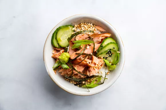 Добавьте семгу и желаемый гарнир: водоросли нори, соленья, лук-шалот и т. п.