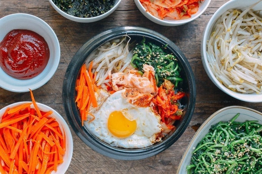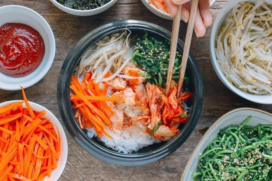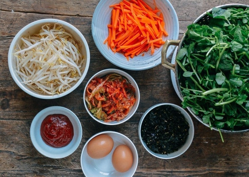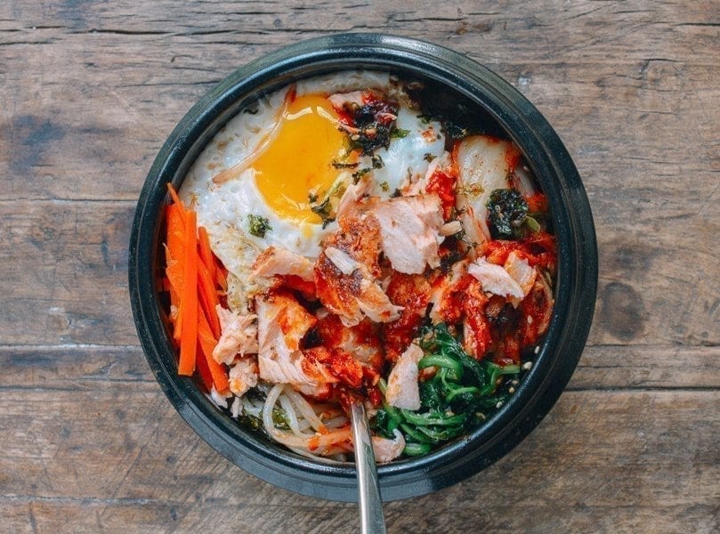 Пока семга готовится, положите в отдельную миску капусту кимчи. Если вы используете водоросли нори, слегка поджарьте их на сковороде и мелко порежьте. Также пожарьте по одному яйцу на порцию. Когда рыба будет готова, порежьте ее на крупные кусочки и можно будет приступать к сборке пибимпаба.