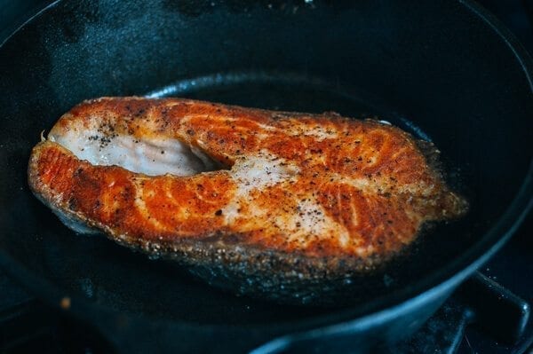 Теперь займитесь рыбой. Посыпьте стейк солью и перцем с обеих сторон. Нагрейте сковороду на средне-сильном огне с 3 столовыми ложками масла. Выложите семгу и жарьте в течение 5 минут. Переверните и готовьте другую сторону еще 5 минут. Время приготовления может быть изменено в зависимости от толщины стейка. Если вы сомневаетесь, просто аккуратно надрежьте ножом центр куска, чтобы проверить готовность.