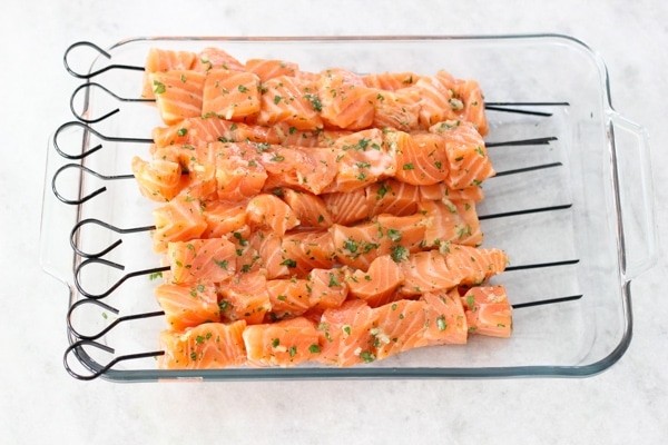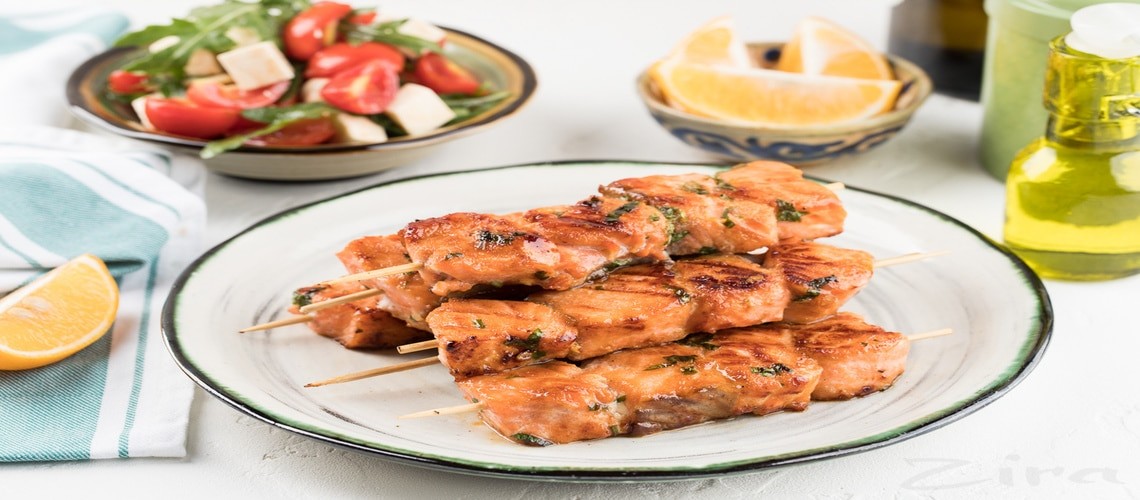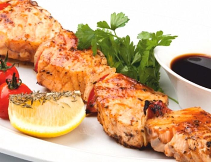 - Далее необходимо жарить куски не больше 10 минут, время от времени переворачивая. Спустя это время, останется снять блюдо с решетки, полить соусом и можно подавать рыбу на шпажках к столу.