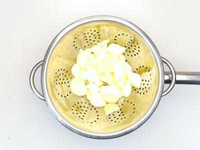 Включите духовку на 220 градусов. Картошку почистите и нарежьте на кусочки. Выложите их в кастрюлю с водой, добавьте немного соли. Варите на сильном огне 10-15 минут до мягкости картошки. Затем слейте воду.
