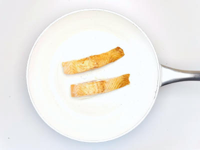 На средне-сильном огне нагрейте сковороду с небольшим количеством растительного масла. Выложите рыбу, посолите и жарьте 2-3 минуты с каждой стороны, пока она почти не будет готова.