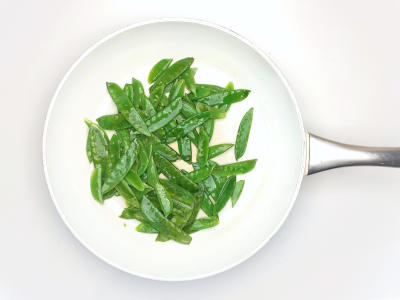 Фасоль разрежьте пополам. Нагрейте сковороду на среднем огне с 20 г сливочного масла. Выложите горох и фасоль в масло, посолите и готовьте 5-6 минут. Выжмите сок половины лимона, накройте крышкой и снимите с огня.