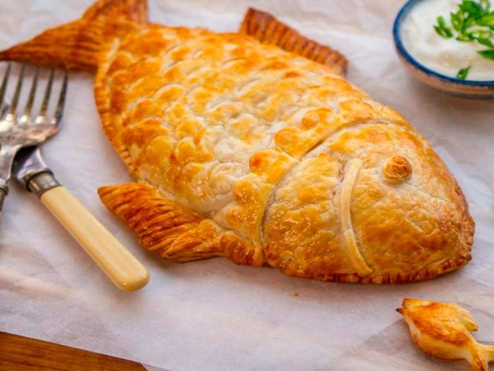 - Хорошо защипните края рыбного пирога. Смажьте его яйцом, выпекайте приблизительно 30 минут до состояния готовности.