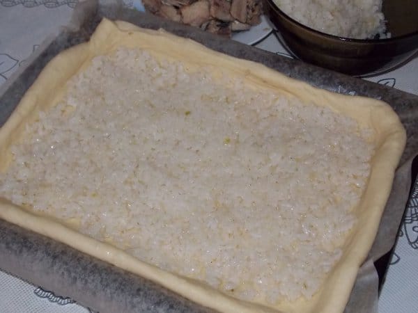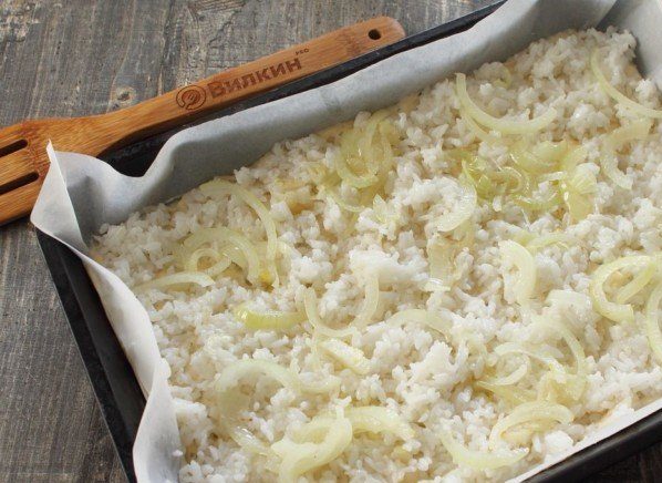 Выложите первый слой пирога с консервами – охлажденный рис.