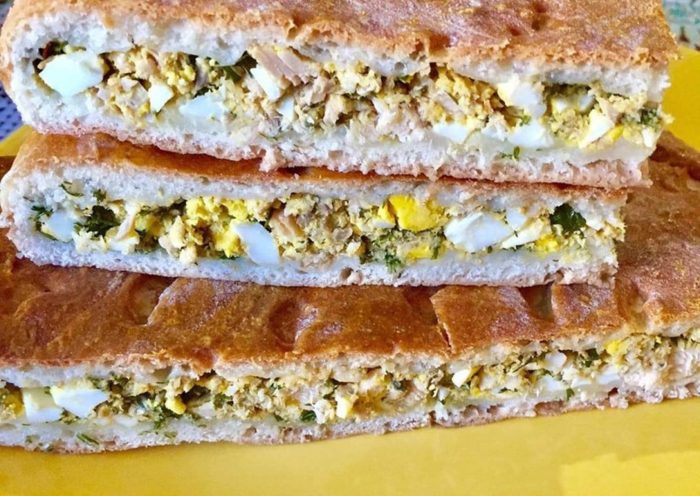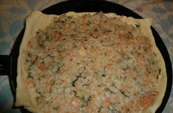 - Начинку для пирога сделайте из консервированной рыбы в виде фарша, добавив зелень, отваренный рис, листья мангольда. Приправьте ее перцем, солью.