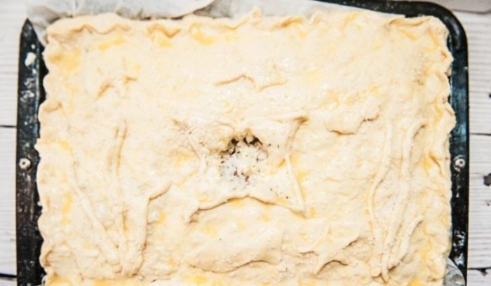- Заверните пирог по краям, перенесите его в форму для выпекания / противень.