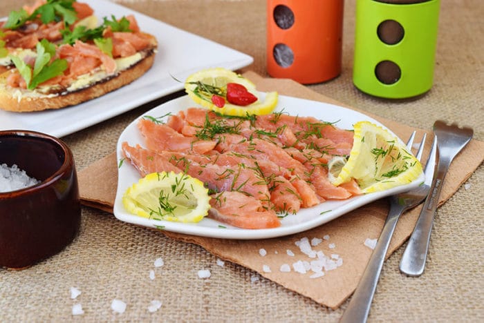 Среди всех разновидностей красных рыб семга отличается очень высоким содержанием жира, поэтому в процессе засолки можно добавить к ней лимон. Эти продукты прекрасно сочетаются друг с другом. Лимон не только придаёт вкусу рыбы пикантность, но и немного уменьшит её жирность.