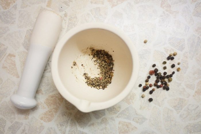 Горошины перца необходимо истолочь в ступке, но не совсем мелко.