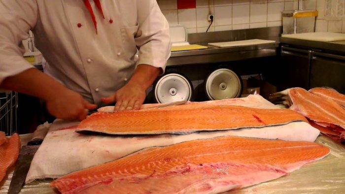 Абсолютно все части горбуши можно использовать в приготовлении блюд, поэтому важно уметь правильно отрезать голову у рыбы. Для этого надо аккуратно просунуть нож под жабры рыбы и только потом отделить её от туловища. Чтобы правильно обезглавить рыбу и в будущем использовать её по назначению, просмотрите фото, где профессиональные повара умело справляются с этим этапом разделки.