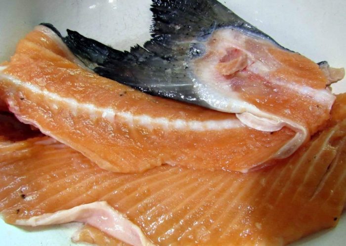 - От второй части горбуши необходимо отсоединить хребтовую кость и рёбра;