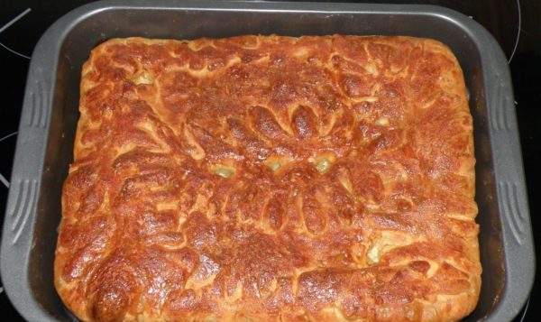 В таком виде поставить пирог в теплое место примерно на 1 ч. По истечении времени поставить в разогретую духовку и печь при 1200 30-40 мин.