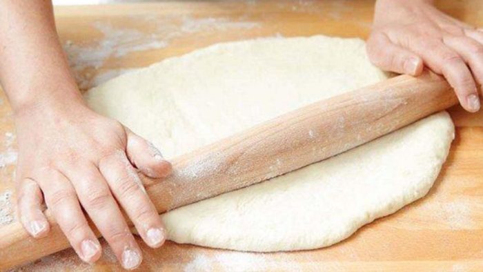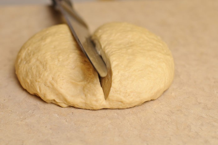 Сначала разделить тесто на 2 части.