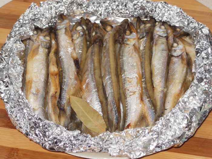 Мойву вначале нужно засолить. Для нее желательно использовать сухой способ засолки, так как при переизбытке влаги мясо во время копчения развалиться.