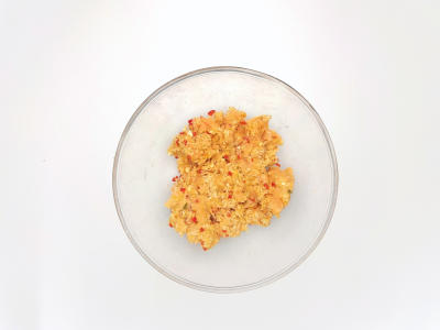 С кеты снимите кожу и нарежьте филе на мелкие кубики, добавьте в миску с пастой карри. Туда же насыпьте панировочные сухари и щепотку соли. Аккуратно размешайте смесь рукой.