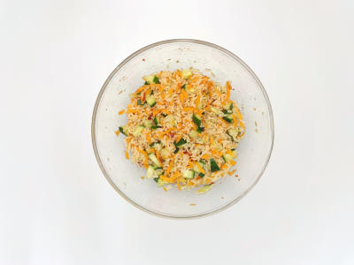 Добавьте охлажденный рис в овощной салат, туда же добавьте оставшееся растительное масло. Кинзу порубите вместе со стеблями.