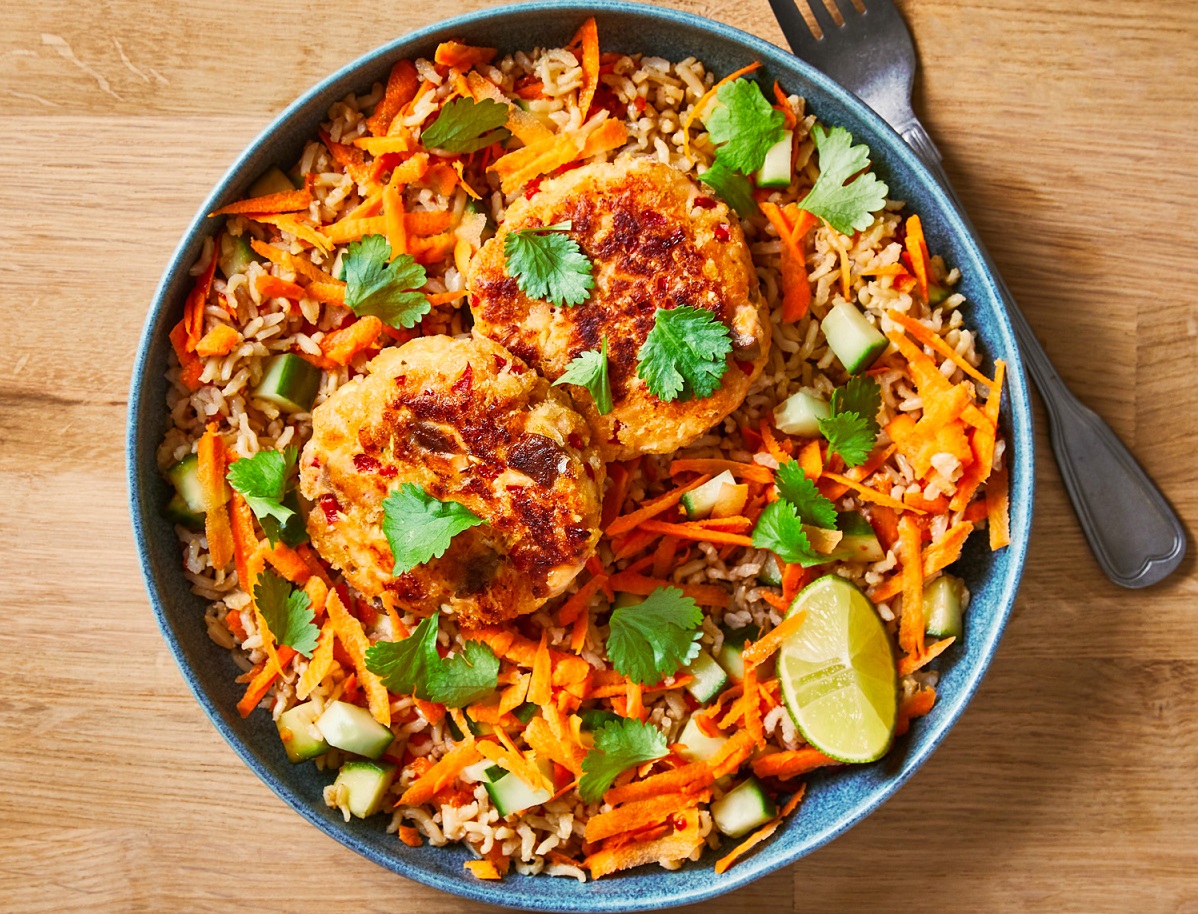 Подавайте котлеты из кеты поверх салата с рисом. Украсьте кинзой и долькой лайма.