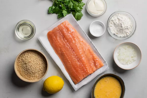 Подготовьте ингредиенты для приготовления котлет с семгой.