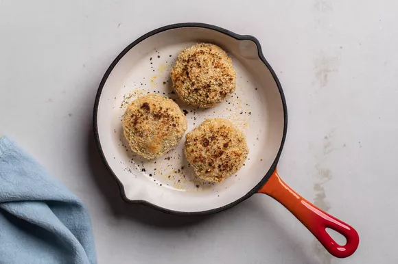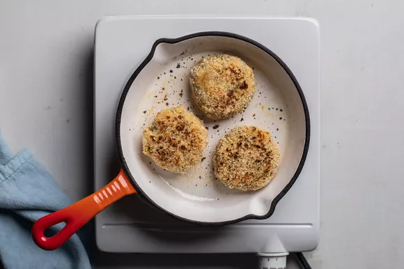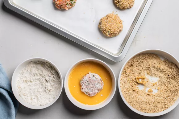 Высыпьте муку в тарелку среднего размера, взбейте яйца в другой миске и добавьте все оставшиеся панировочные сухари в третью тарелку. Затем сначала обваляйте каждую котлету в муке, затем окуните во взбитые яйца и, наконец, в сухари. Положите их на сковороду и дайте обсохнуть в течение 10 минут, прежде чем жарить или запекать.