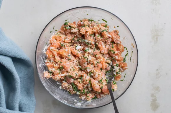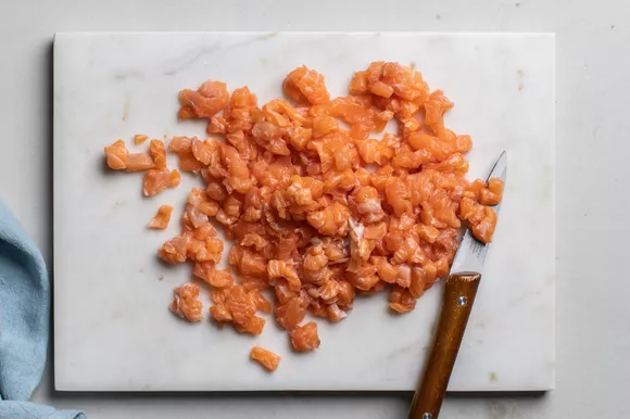 Нарежьте на кусочки размером примерно в 0,5 см. Не используйте для этого кухонный комбайн, так как кусочки будут слишком маленькими и рыба получится пастообразной.
