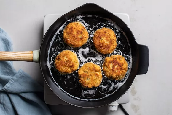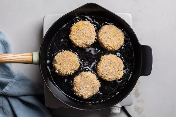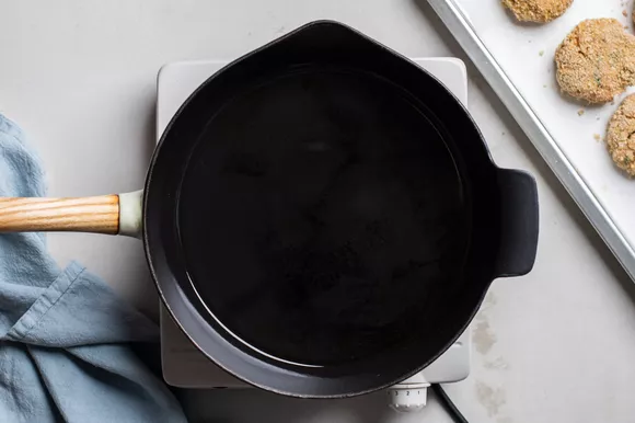 Для обжаривания котлет из семги налейте около 1-2 см растительного масла в сковороду с толстым дном или чугунную и нагревайте на средне-высоком огне около 3-х минут.