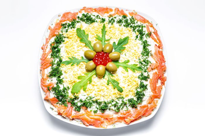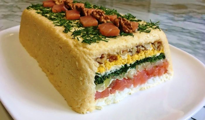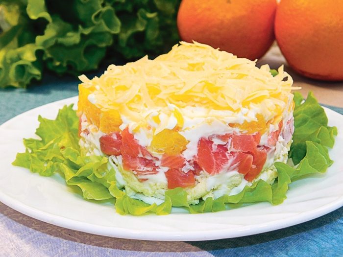 Салат с красной рыбой со звучным названием «Императрица», внешне похожий на настоящий закусочный торт, займет достойное место в праздничном меню. А сочетание семги с красной икрой действительно можно назвать императорским.