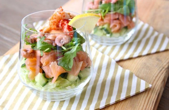 Красиво оформленный легкий салат-коктейль с красной рыбой без майонеза способен стать хорошим дополнением к меню праздничного угощения. Приготовить его достаточно просто.