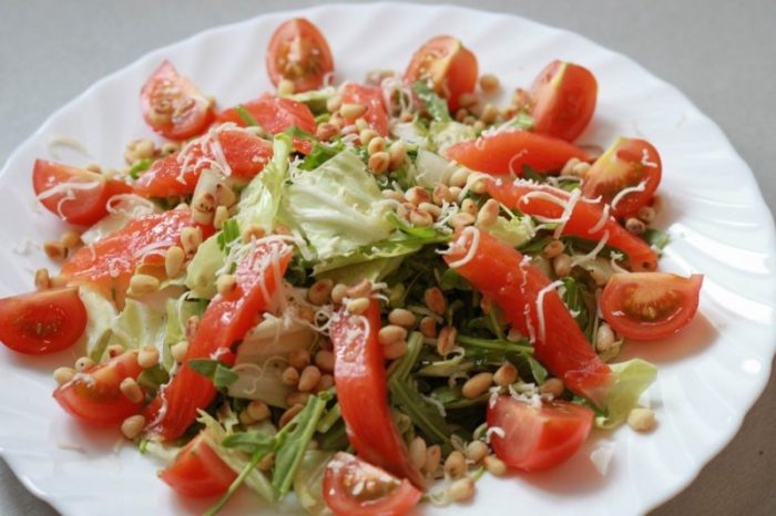 Освежающий и одновременно пикантный вкус салата с соленым лососем и томатами порадует вкусовые рецепторы и поможет пополнить витаминный запас организма.
